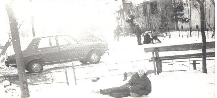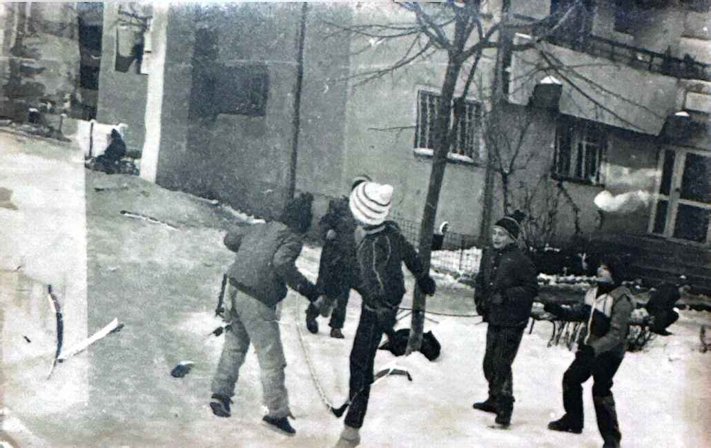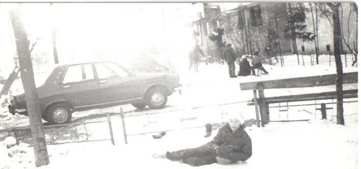 Pe fundal se văd sănii. In fața la scările A, B și C la R1, zăpada și gheața se topeau târziu, că era veșnic umbră, nu dădea soarele. Seara, dădeam cu apă, să iasă gheața mai bună dimineață, dar trebuia să ieșim devreme, că altfel dădea tanti Sanda de la parter cu sare. Iar dacă cobora nea Nicu de la 1 la o țigară pe băncuța din spatele porții, de sub prun, se suspeda orice meci internațional, că era pericol să nu-l lovim. Bă, dar dacă loveai una cu mingea, erai mâncat instantaneu de un conducător auto direct de la balcon și aveam maidanul suspendat o săptămână.