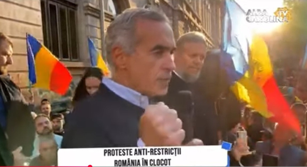 Preotul nostru paroh de la Biserica Sf. Varvara din Centru, îi e aproape de mai mulți ani. Foto dreapta, din 2021, de la protestul din pandemie, unde Georgescu a ținut un discurs copiat 100% de la Mareșalul Ion Antonescu. Preotul Niță a fost permanent pe scenă alături de el și de Dan Puric, protestând împotriva măsurilor antipandemie.