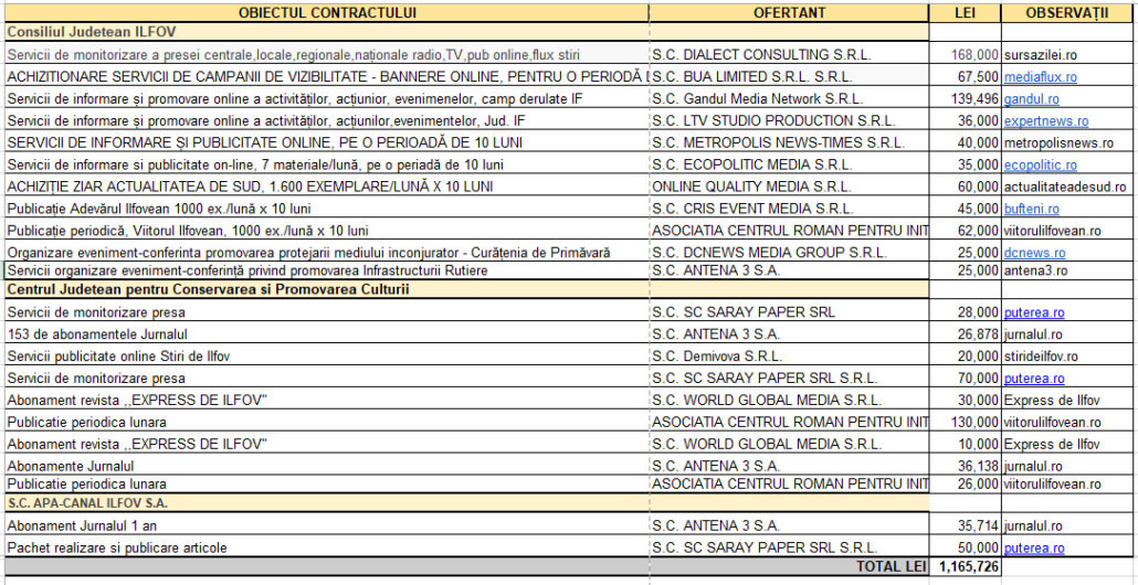 In jurul Consiliului Județean Ilfov roiesc o serie de oameni de așa-zisă presă, care primesc bani prin contracte care par fictive. Având în vedere că e vorba despre articole banale, stil comunicate, pe site-uri obscure în general, fără trafic, totul pare doar o sifonare de bani către camarila ilfoveană.