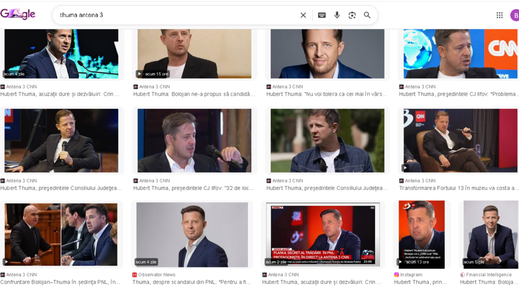 Foto sus primale articole din cautarea pe google după „thuma antena 3”, toate articole de promovare, nimic critic, nicio dezbatere. O situație doar pe ultimii 3 ani și pe cele 3 entități controlate de Hubert Thuma – Consiliul Județean Ilfov, Centrul Județean pentru Conservarea și Promovarea Culturii Tradiționale ILFOV și Apa Canal Ilfov: