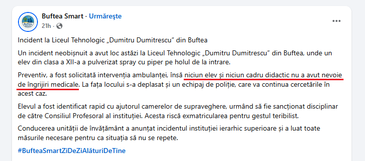 „La data de 07 octombrie, în jurul orei 10:00, poliţişti din cadrul Poliţiei Oraşului Buftea au fost sesizaţi prin apel 112 de către o persoană cu privire la faptul că, în cadrul unei unităţi de învăţământ, din oraşul Buftea, persoane necunoscute ar fi pulverizat cu spray lacrimogen, în incinta unităţii, afectând mai multe persoane.
