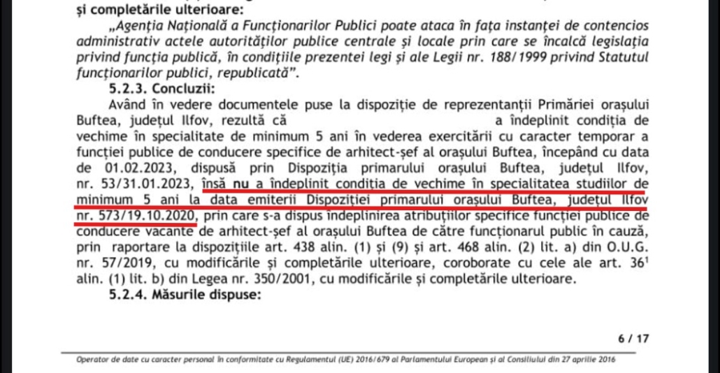 Acesta spune negru pe alb, subliniat de mine cu roșu, că Tighean a ocupat ilegal funcția temporară de arhitect șef, prin dispoziția primarului 573/19.10.2020. De ce era ilegal? Ne spune tot ANFP… nu a îndeplinit condiția de vechime în specialitatea studiilor de minim 5 ani la data emiterii Dispoziției primarului nr. 573/19.10.2020.